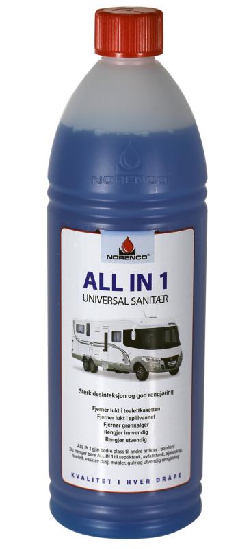 Universal sanitærvæske som kan benyttes overalt i/utenpå campingvogn/bobil. Sterkt desinfiserende og god rengjøring. All In 1 gjør bedre plass til andre artikler i bobilen: du trenger bare ett produkt til: septiktank, avfallstank, kjøleskap, toalett, vask av dusj, bord, gulv og utvendig rengjøring. Fjerner lukt fra toalett Forhindrer sur lukt fra avfallsvann Rengjør og desinfiserer