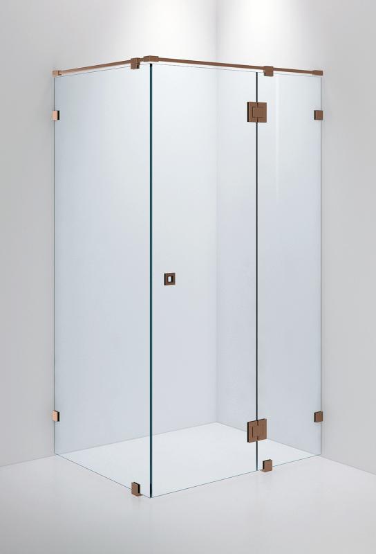 Dusjhjørne i 8 mm glass med to faste vegger og en dør hengslet i den minste faste veggen. Måltilpasses på yttermål 400-1200 mm (fast vegg) x 500-1500 mm (fast vegg og dør). Maks bredde på dør som er hengslet i fast vegg er 750 mm. Artikkelnummer og pris gjelder klart glass og beslag i Brushed Bronze. Kan også fås i andre glass; Timeless, Frosted, Smoke, Opal Clear, Opal Frost og Dark Frost. Beslagene kan også fås i Polished, Brushed Stainless, Matte Black og Brushed Brass.