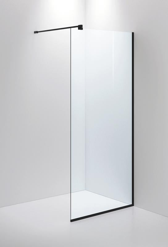 Stilren dusjvegg i 8 mm glass med skinne mot gulv og vegg. Måltilpasses på bredde 400 - 1200 mm. Artikkelnummer og pris gjelder klart glass, skinner og støttestag i matt svart. Kan også fås i andre glass; Timeless, Frosted, Smoke, Opal Clear, Opal Frost og Dark Frost. Skinner og støttestag kan også fås i blank krom.