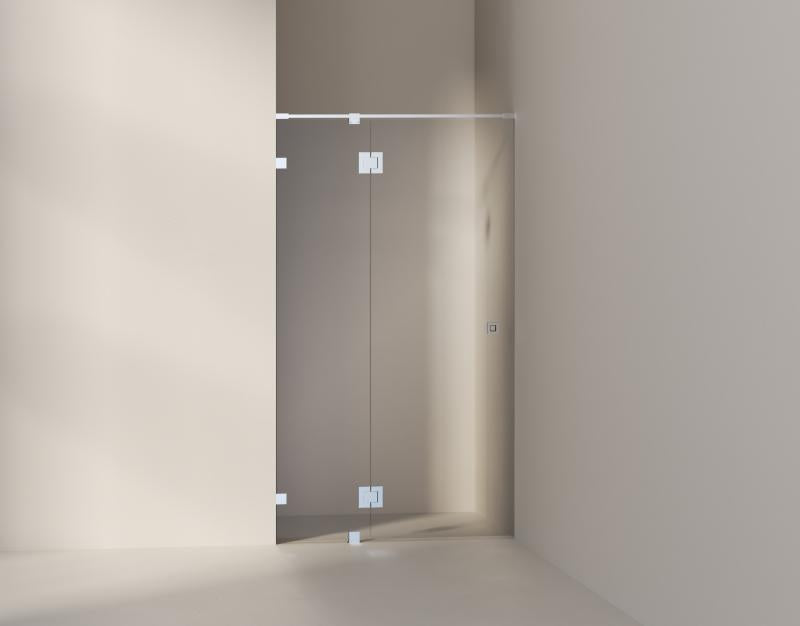 Nisjeløsning i 8 mm glass med dør og fast vegg, hvor døren er hengslet i den faste veggen. Måltilpasses på nisjebredde 500 - 1500 mm. Maks bredde dør 750 mm. Artikkelnummer og pris gjelder klart glass og beslag i blank krom. Kan også fås i andre glass; Timeless, Frosted, Smoke, Opal Clear, Opal Frost og Dark Frost. Beslagene kan i tillegg til blank krom fås i Matte Black, Brushed Stainless, Brushed Brass og Brushed Bronze.