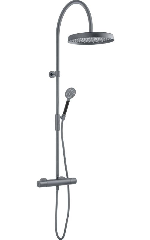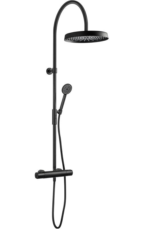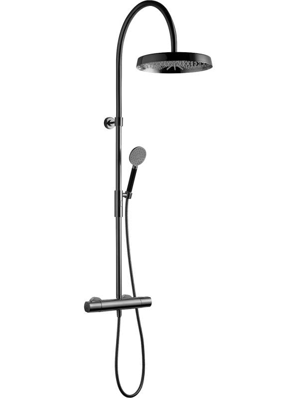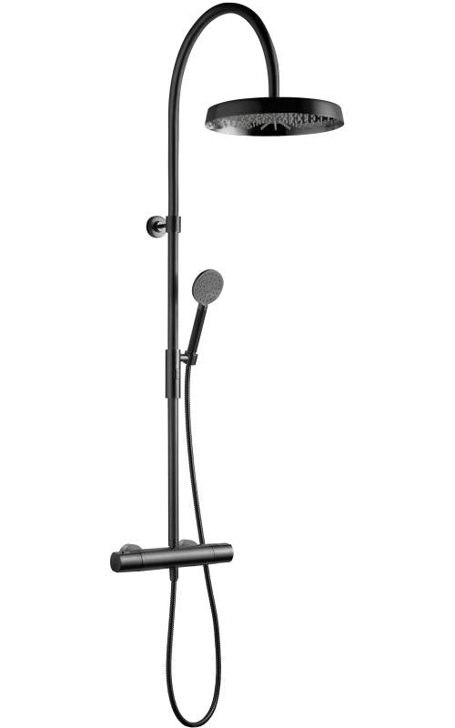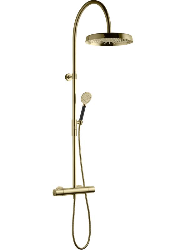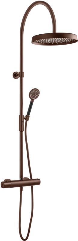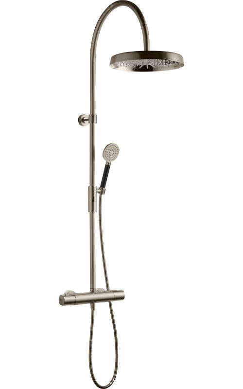 Takdusj med trykk- og termostatstyrt dusjbatteri og hånddusj.
