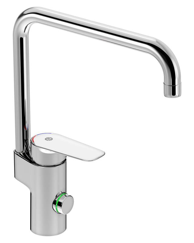 Gustavsberg Atlantic kjøkkenkran med høy tut. Med elektronisk avstengning for oppvaskmaskin, en ny og smart innovasjon som reduserer skader ved vannlekkasje.