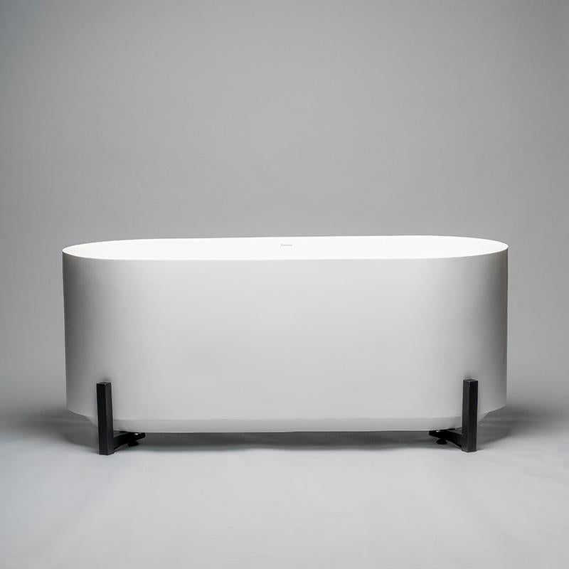 Et eksklusivt badekar i førsteklasses materiale og med den nyeste teknikken. Spennende kontraster med en silkematt overflate og tynne fine linjer på badekarets kanter som møter robuste svartlakkerte ben i rustfritt stål. Hvert badekar lages for hånd i det naturlige materialet Solid surface. Leveres med bunnventil i krom, avløpsrør og justerbare føtter.