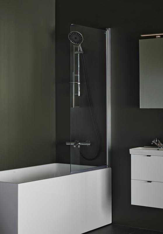 Svingbar badekarsvegg med limbar profil i aluminium for montering på vegg, 6 mm herdet sikkerhetsglass. Løftehengsler. Høyde 1500 mm. Monteres mot fast underlag. Kan monteres med 12 mm utenpåliggende rør cc 35 mm. Forlengelsesprofil finnes til utenpåliggende rørdraging. 22 mm slepelist inngår.