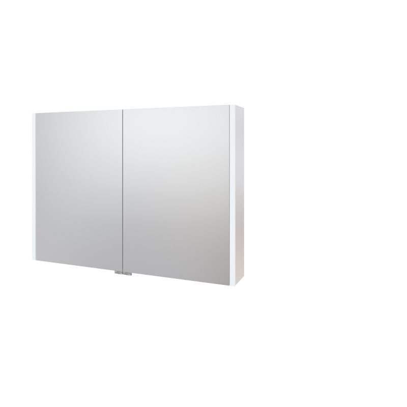 Speilskap med to dører. Speil på innside/utside dør og på siden av skrog. Underbelysning og lys på siden av dørene. Enkel stikkontakt i skapet. Glasshyller. IP44.