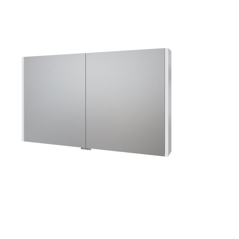 Speilskap med to dører. Speil på innside/utside dør og på siden av skrog. Underbelysning og lys på siden av dørene. Enkel stikkontakt i skapet. Glasshyller. IP44.