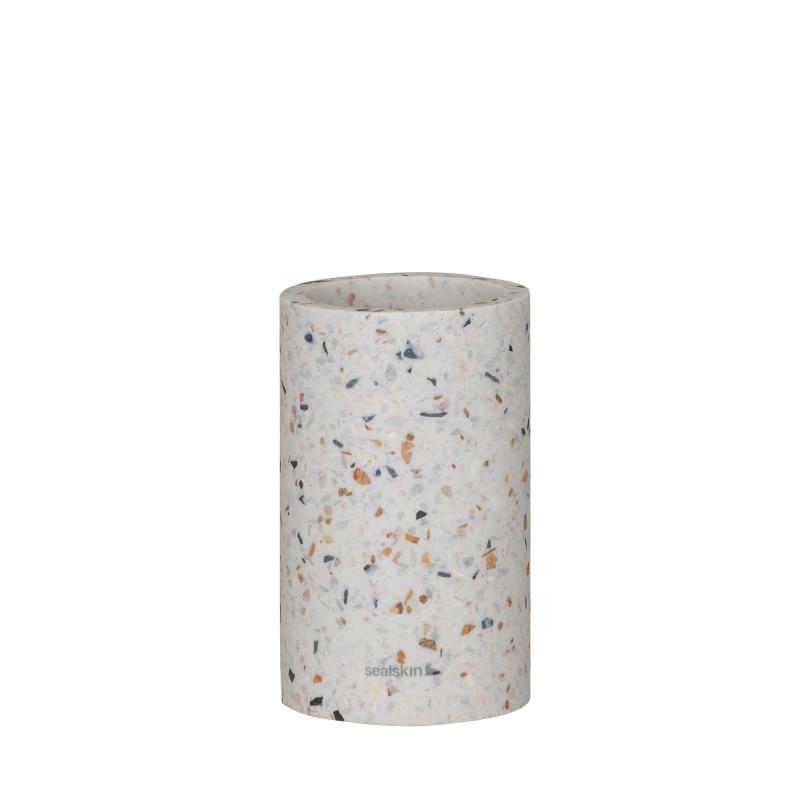 Enkel tannbørsteholder i trendy og tidløst terrazzo-design. Produsert i hvit keramikk med flerfarget dekor. Str: H123mm / Ø75mm