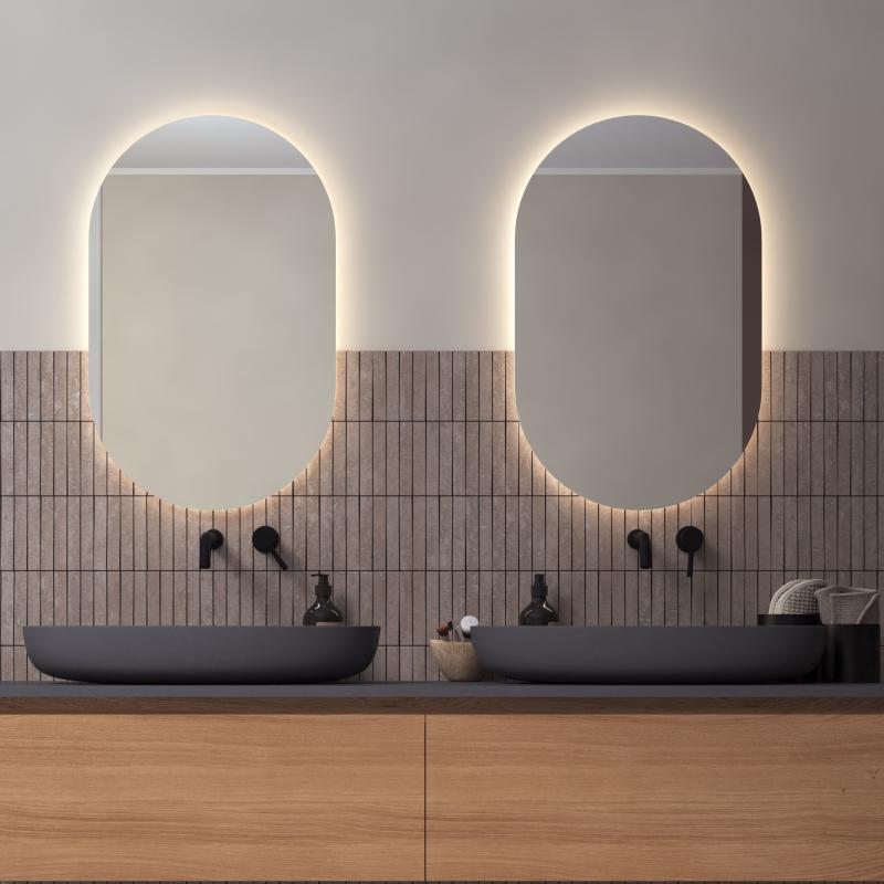 Ovalt speil som kan monteres både på høykant og i bredden.80x50cm. Med bakenforliggende LED-belysning