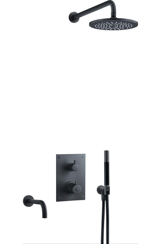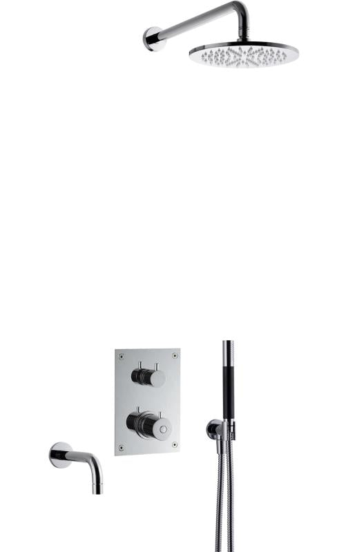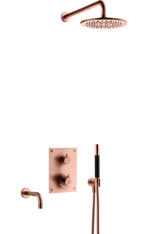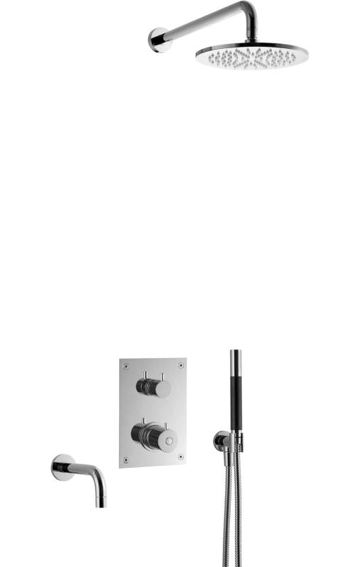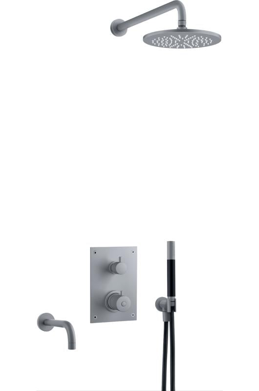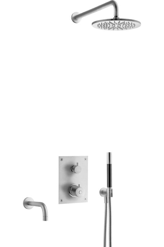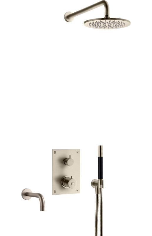 Komplett trykk- og termostatstyrt innbyggingssystem med ha?nddusj, badekartut og taksil som vist pa? bildet. Inkludert innbyggingsboks T BOX 2.0 368.