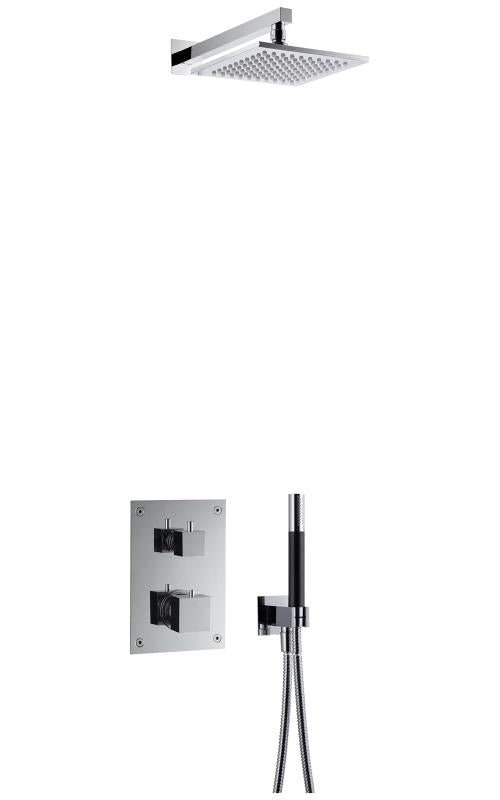 Komplett trykk- og termostatstyrt innbyggingssystem med ha?nddusj og taksil som vist pa? bildet. Inkludert innbyggingsboks T BOX 2.0-268.