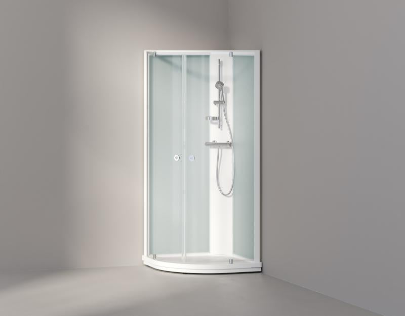Stilig dusjkabinett i 6 mm glass med store buede dører med pivotåpning, minimalt med beslag for et luftigere uttrykk og et svært lavt designet kar. Bakvegger i frostet glass. Dusjsett er inkludert, men ikke blandebatteri. Dette kabinettet har dessuten markedets mest sjenerøse åpningsmål - hele 800 mm. Artikkelnummeret gjelder str. 910x910 mm med dører i klart glass. Finnes også i str. 1010x1010 mm. Høyde 2110 - 2130 mm til øvre kant ramme. Kabinettet har regulerbare ben.
