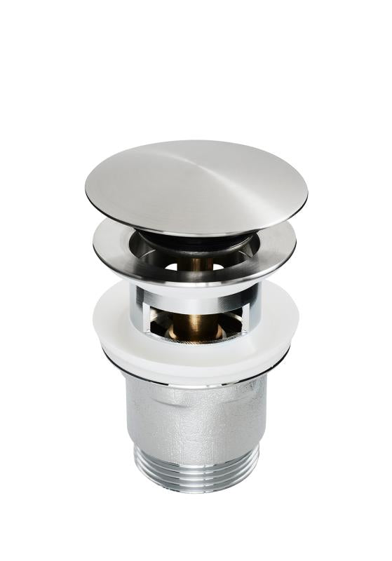 Bunnventil pop-up av rustfritt stål med stort fjærbelastet lokk med børstet overflate. Til servant med overløp.