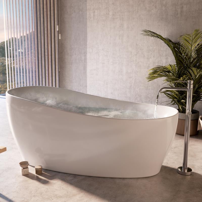 Stilfullt design lavet i Lucite MMA®. 1700 x 850mm. Gir en badeopplevelse for alle sansene. Et moderne utseende som skaper et eksklusivt bad. Med é ryggstøtte og avløp i fotenden. Inklusiv av- og overløpssett. Vekt 53kg.
