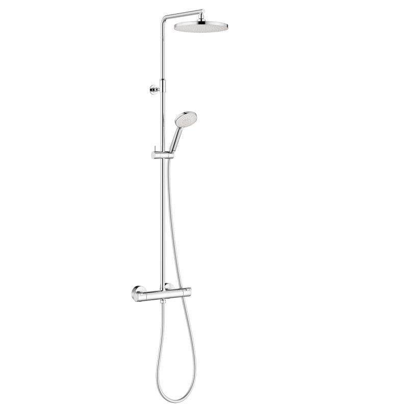 Core takdusj er en komplett takdusj med stang med fleksibel justering på høyden, håndusj med tre innstillinger, takdusjhode på 230mm og 1500mm sølvfarget glatt slange. Termostatkran med skoldesperre og grep med knapp som gjør det enkelt å endre temperatur og vannmengde.