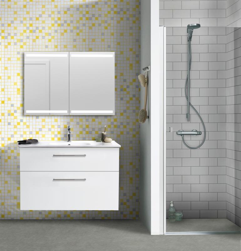 Dansani Easy er kvalitetsmøbler til gunstige priser. Kantate porselensservant i moderne tynt design, med hvit matt servantskap i høyde 64 cm med 2 skuffer og soft close. Håndtak 33 cm i krom. Level speilskap med lysstyring og integrert LED-belysning i topp og bunn.