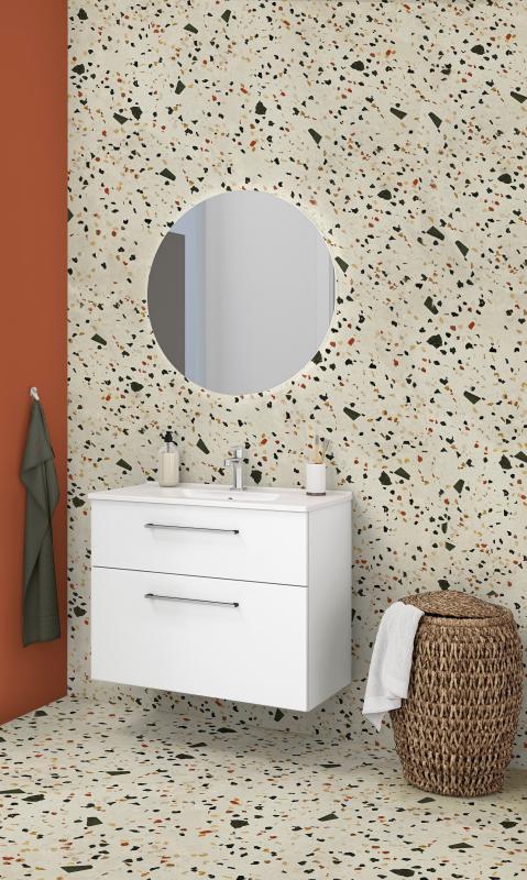 Dansani Easy er kvalitetsmøbler til gunstige priser. Kantate porselensservant i moderne tynt design, med hvit matt servantskap i høyde 64 cm med 2 skuffer og soft close. Håndtak 33 cm i krom. Rundt Corona speil med integrert LED bakgrunnsbelysning