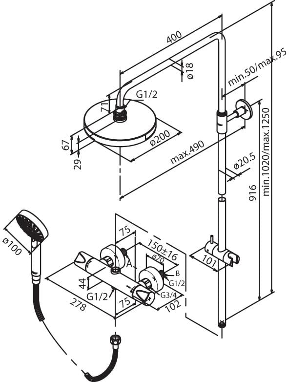 Takdusj med 200mm dusjkopp. Termostat med eco-klik og skoldesperre. Vender i termostat.