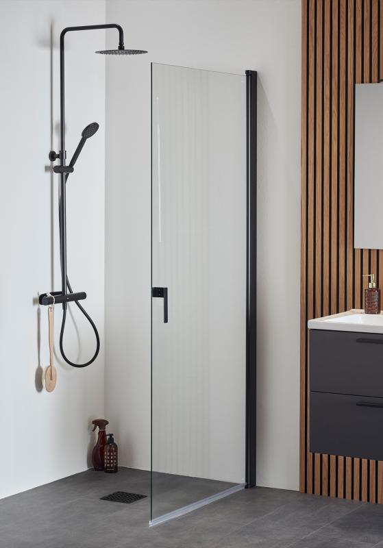 Rett dusjdør med klart glass i svart matt eller aluminium som passer det mindre baderommet fordi den kan foldes inn når den ikke er i bruk. Dusjdøren er stabil med en veggprofil i aluminium som kan monteres med skruer eller limbrikker. Den har en patentert løsning for enkel installasjon og justering, Hafa's InstaQuick. Dusjdøren har løftehengsler for at den ikke skal berøre gulvet ved åpning og er vendbar så du kan velge hvilken vegg den skal monteres på. Dusjdøren kan kombineres med andre dører og vegger i IglooPro-serien. 6 mm herdet sikkerhetsglass. Høyde 2000 mm. Kan monteres med utenpåliggende rør, 35 mm. 18 mm slepelist og håndtak er inkludert.