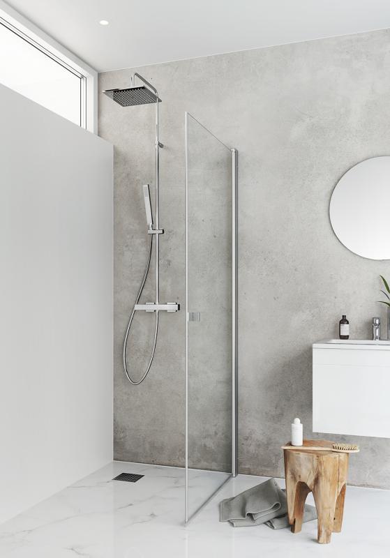 Rett dusjdør med klart glass i svart matt eller aluminium som passer det mindre baderommet fordi den kan foldes inn når den ikke er i bruk. Dusjdøren er stabil med en veggprofil i aluminium som kan monteres med skruer eller limbrikker. Den har en patentert løsning for enkel installasjon og justering, Hafa's InstaQuick. Dusjdøren har løftehengsler for at den ikke skal berøre gulvet ved åpning og er vendbar så du kan velge hvilken vegg den skal monteres på. Dusjdøren kan kombineres med andre dører og vegger i IglooPro-serien. 6 mm herdet sikkerhetsglass. Høyde 2000 mm. Kan monteres med utenpåliggende rør, 35 mm. 18 mm slepelist og håndtak er inkludert.