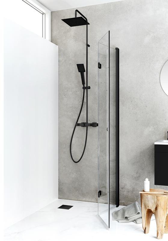 Foldbar dusjdør med klart glass som frigjør plass og gjør det mulig å skape en smart dusjløsning for det lille baderommet. Den foldbare døren kan lett foldes inn mot veggen når den ikke brukes og skaper en praktisk dusjløsning også om toalett eller baderomsmøbler er plassert i nærheten av dusjen. Dusjdøren er stabil med en svart eller aluminiumsfarget veggprofil som kan monteres med skruer eller limbrikker. Den har en patentert løsning for enkel installasjon og justering, Hafas InstaQuick. Dusjdøren har løftehengsler for at den ikke skal berøre gulvet når den åpnes og er vendbar så du kan velge hvilken vegg den skal installeres på. Dusjdøren kan kombineres med andre dører og vegger i IglooPro-serien. 6 mm herdet sikkerhetsglass. Høyde 2000 mm. Kan monteres med utenpåliggende rør, 35 mm.