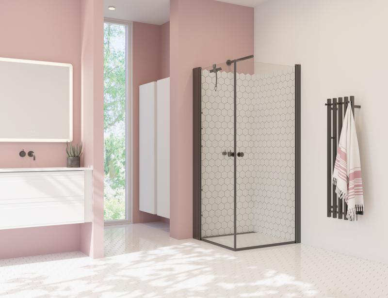 Klassisk og veldig populært dusjhjørne med to dører som kan åpnes både utover og innover når du ikke bruker dusjhjørnet. Det gir god gulvplass på et lite bad og åpner rommet. Elegant og tidløs stil med slanke, firkantede profiler i sort matt. Perfekt montering ved skjeve vegger og gulv takket være gode justeringsmuligheter. Høyde på 200 cm gir en effektiv dusjavskjerming, spesielt ved takmontert dusjhode. 6 mm klart sikkerhetsglass med EasyCare for enkel rengjøring og vedlikehold. Her i kombinasjon med Tower oppbevaringsreol til den ene døren, så du unngår rot i dusjområdet.