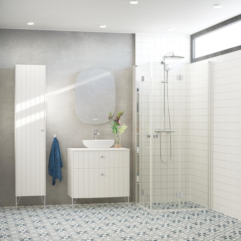En smart løsning, hvor begge dører kan foldes inn når du ikke benytter dusjhjørnet, så de opptar minst mulig plass i rommet. Det gir god gulvplass på et lite bad og åpner rommet. Elegant og tidløs stil med slanke, firkantede profiler i sateng. Perfekt montering ved skjeve vegger og gulv takket være gode justeringsmuligheter. Høyde på 200 cm gir en effektiv dusjavskjerming, spesielt ved takmontert dusjhode. 6 mm klart sikkerhetsglass med EasyCare for enkel rengjøring og vedlikehold. Her i kombinasjon med Tower oppbevaringsreol til den ene døren, så du unngår rot i dusjområdet.