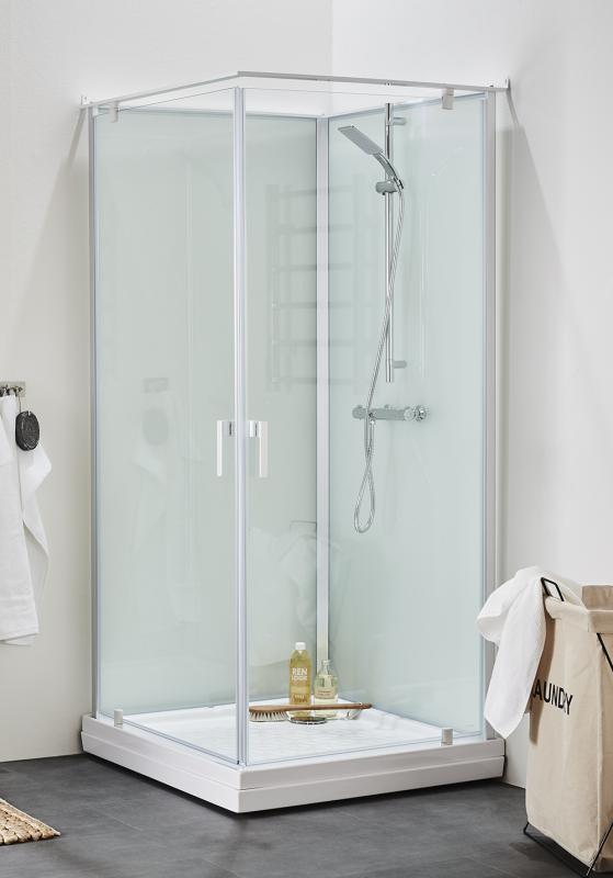 Elegante profiler og store glassflater gir et luftig og stilrent inntrykk. Totalhøyde 2000 mm som gjør det mulig å plassere kabinettet i et rom med takhøyde på 2,05 m. 5 mm herdet sikkerhetsglass med bakvegger i frostet glass. Profiler og håndtak i aluminium med matt sølv finish. Lavt dusjkar i sanitetsakryl 115 mm med rustfritt sveiset stativ og avtagbar front. Magnetfunksjon ved lukking. Dusjsett er inkludert og kabinettet er tilpasset for blandebatteri cc 150/160 mm. Blandebatteriet monteres på høyre eller venstre side på 80x80 og 90x90 mens 70x90 alltid har blandebatteriet på 70 cm siden. Dusjkabinettet monteres helt uten bruk av silikon.