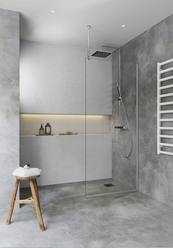 Klassisk dusjvegg i klart glass med profiler i aluminium eller svart matt mot vegg og gulv som gjør dusjveggen stabil og holder vannet inne. Dusjstangen kan monteres på tre måter: mot vegg, mot tak eller i vinkel mot samme vegg som dusjen monteres på. Stangen er 1200 mm lang og kan kappes til valgfri lengde. Vendbar. 8 mm herdet sikkerhetsglass. Høyde 2000 mm. Det finnes forlengelsesprofil for utenpåliggende rørtrekking.