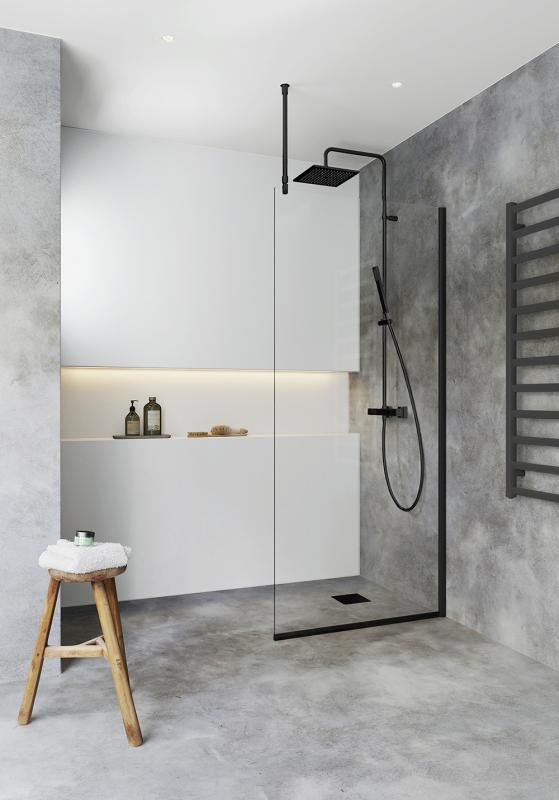 Klassisk dusjvegg i klart glass med profiler i aluminium eller svart matt mot vegg og gulv som gjør dusjveggen stabil og holder vannet inne. Dusjstangen kan monteres på tre måter: mot vegg, mot tak eller i vinkel mot samme vegg som dusjen monteres på. Stangen er 1200 mm lang og kan kappes til valgfri lengde. Vendbar. 8 mm herdet sikkerhetsglass. Høyde 2000 mm. Det finnes forlengelsesprofil for utenpåliggende rørtrekking.