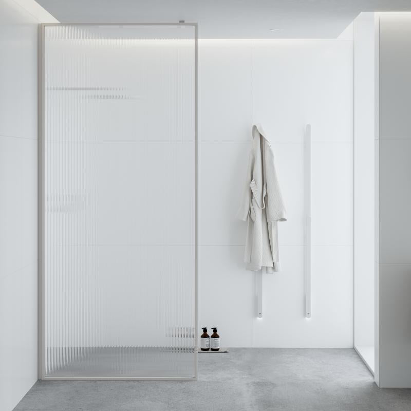 Fast dusjvegg i 6 mm glass med ramme. Denne modellen fås både som måltilpasset og på standard bredde 900 mm. Artikkelnummer og pris gjelder standard bredde 900 mm, retroglasset Sway og ramme Stone. Finnes også i andre glass; Frosted, Smoke og Clear. Rammen kan også fås i Onyx utførelse.