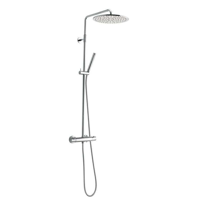 Komplett sett med 300mm stor takdusj, termostatkran med vender integrert. Teleskopstang - justerbar i høyden ved montering.