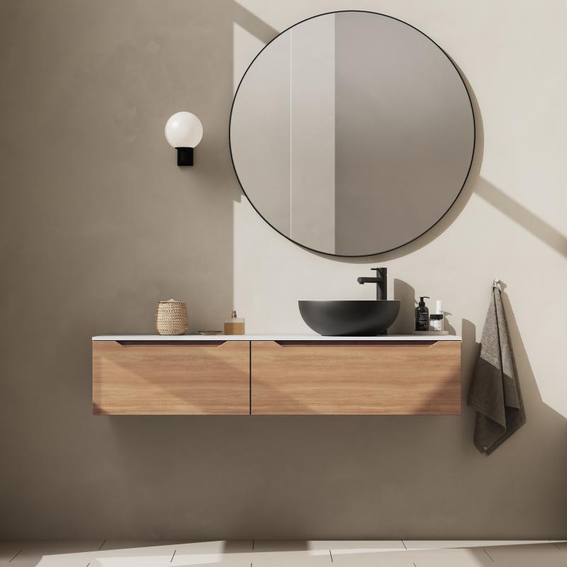 EMMA 1 skuffs i 60 + 80 cm underskap, Corianplate med EIR servant. ØYRI speil utan lys i 100 cm med sort ramme
