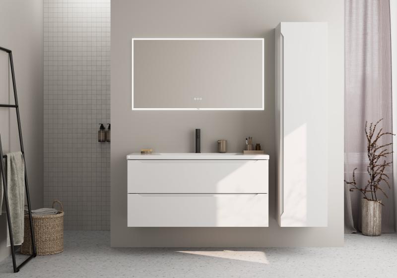 EMMA kvit 120 cm med HEINE servant i porselen. FRAMFJORD speil og høgskap 40 cm med hyller.