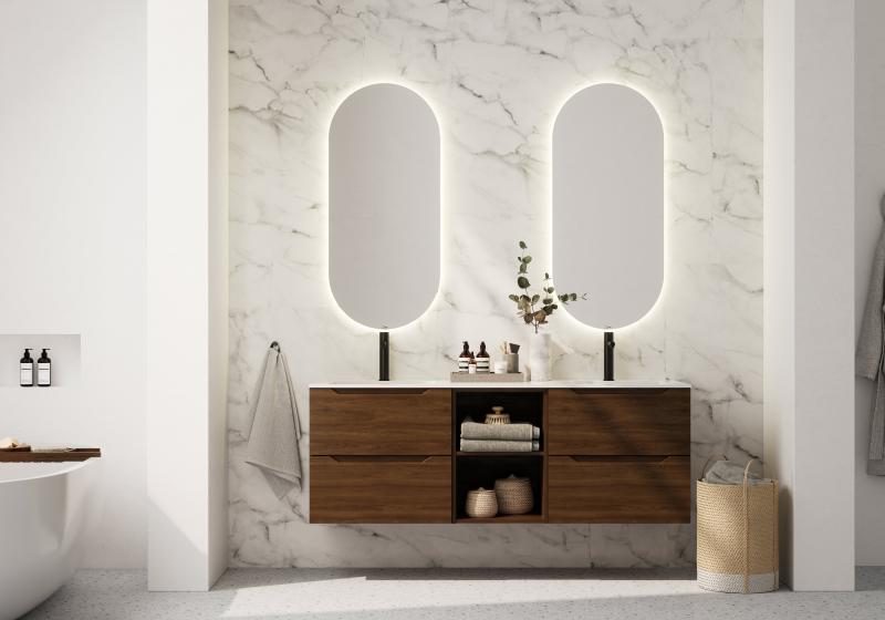 EMMA mørk eik 60 cm x 2. Åpen hylle 40 cm. Corianplate med 2 servanter EIR. TISTEL ovalt speil med baklys.