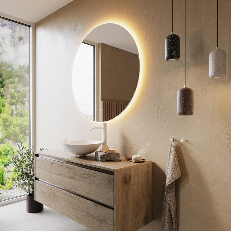 Eris møbelsett i grå eik med sorte lister. Inkludert benkeplate, Sicilia porselensservant og Grace speil Ø100cm.