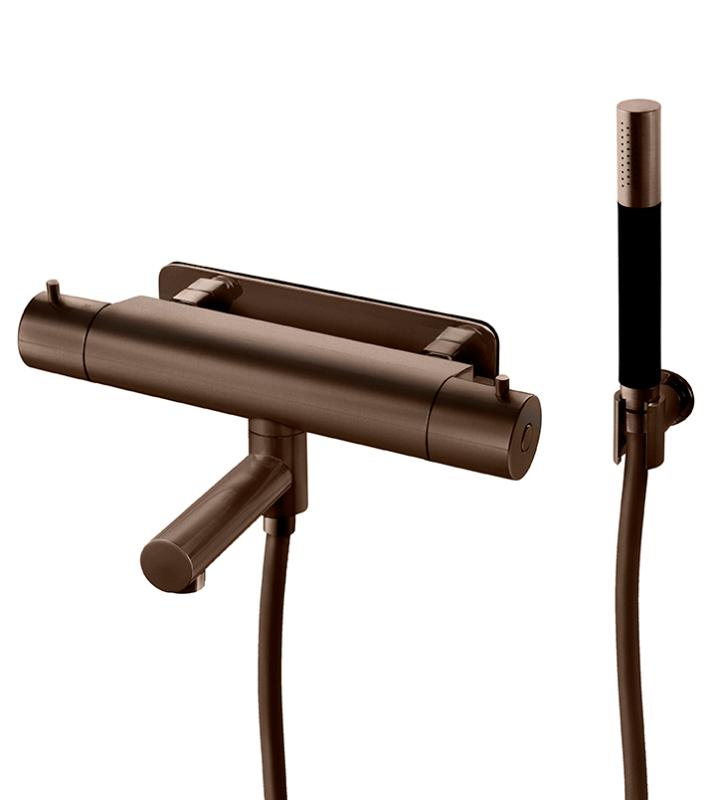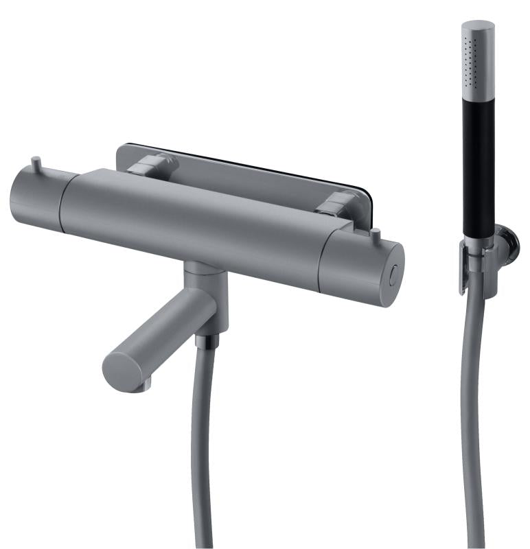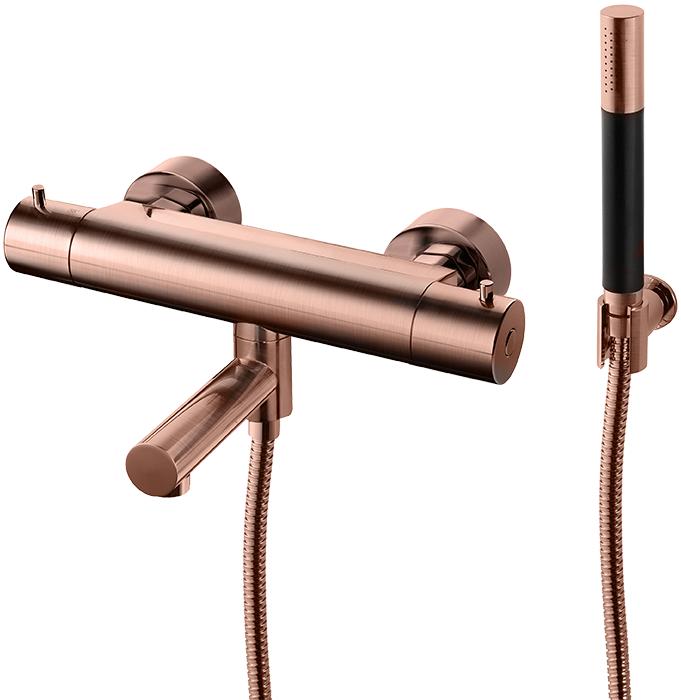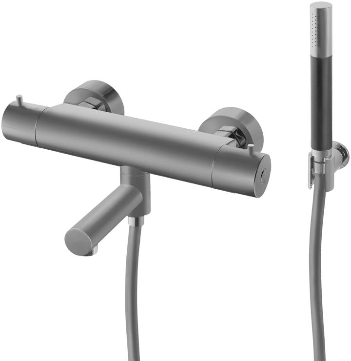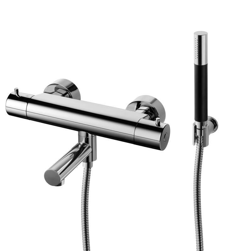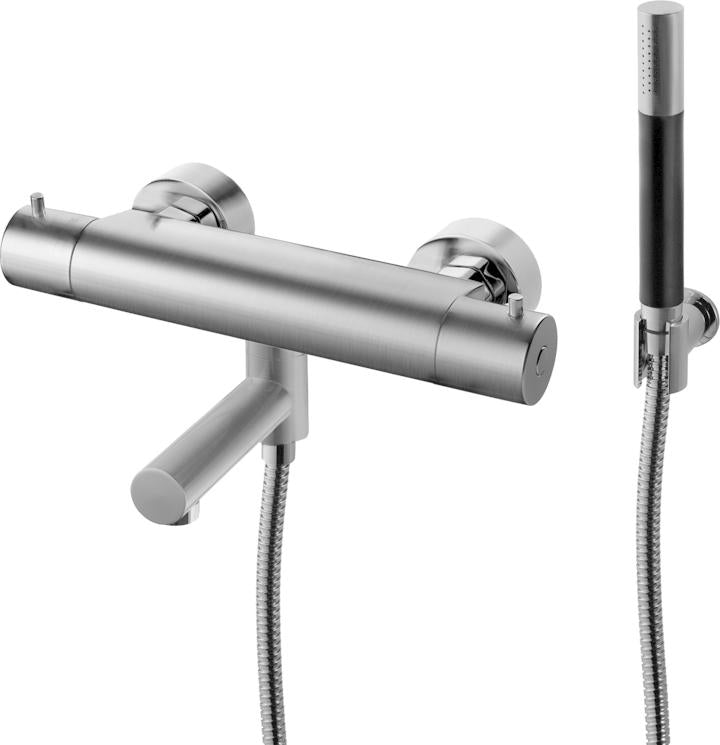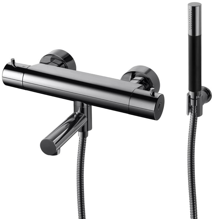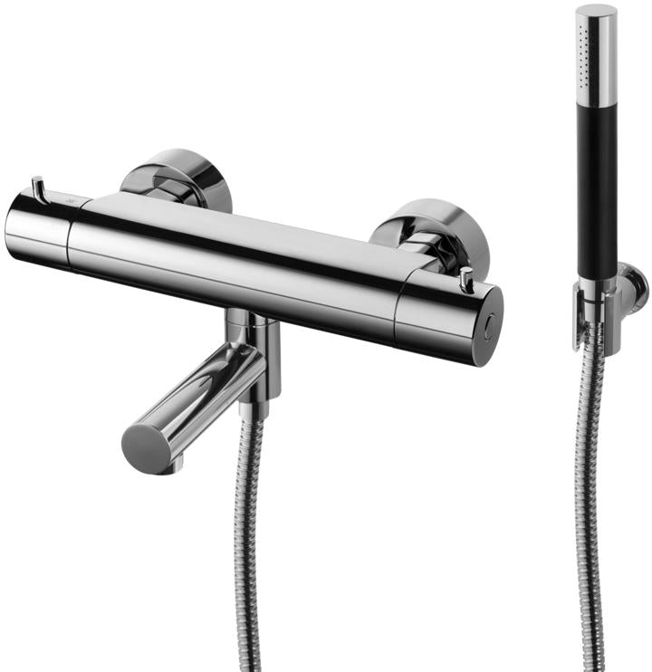 Trykk- og termostatstyrt dusj- og badekarbatteri med svingbar tut, hånddusj, dusjslange og veggfeste.