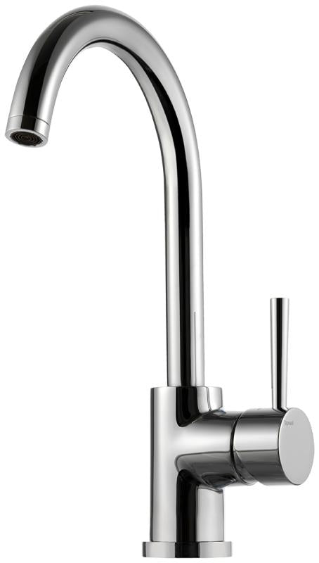 Ettgreps kjøkkenbatteri med høy buet tut og uten avstengning for oppvaskmaskin.