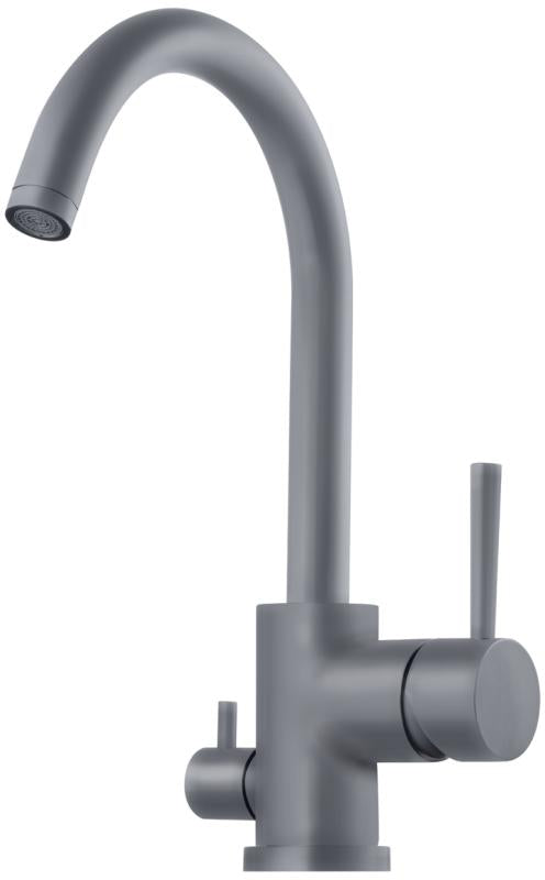 Ettgreps kjøkkenbatteri med høy buet tut og avstengning for oppvaskmaskin.