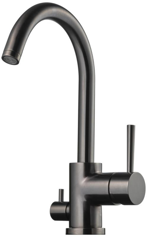 Ettgreps kjøkkenbatteri med høy buet tut og avstengning for oppvaskmaskin.