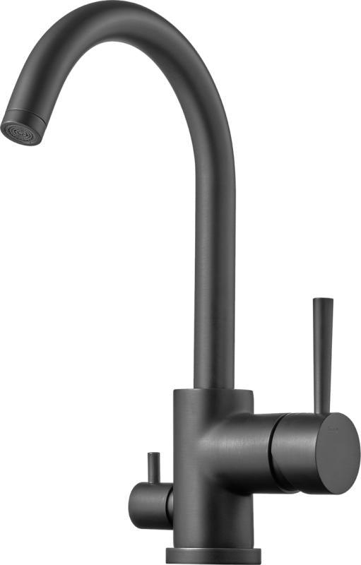 Ettgreps kjøkkenbatteri med høy buet tut og avstengning for oppvaskmaskin.