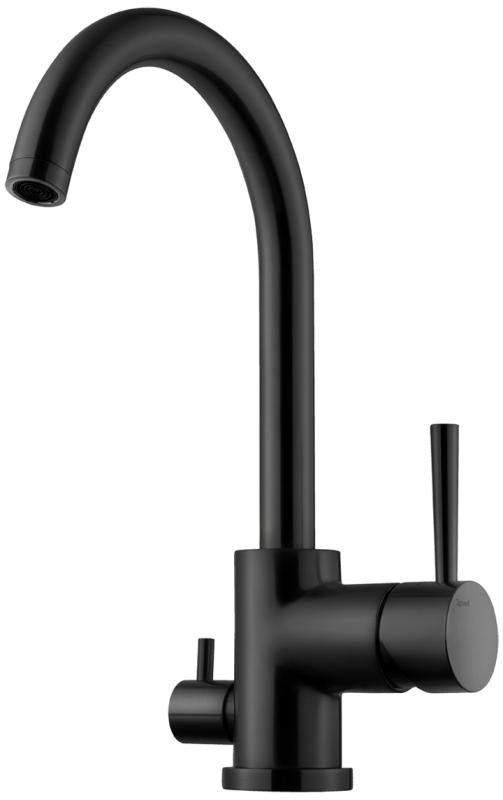 Ettgreps kjøkkenbatteri med høy buet tut og avstengning for oppvaskmaskin.