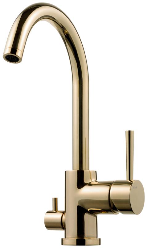 Ettgreps kjøkkenbatteri med høy buet tut og avstengning for oppvaskmaskin.