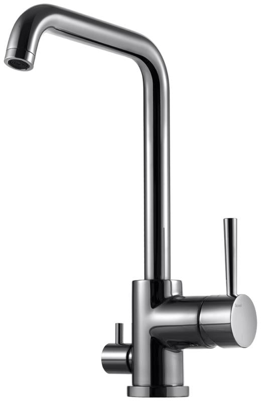 Ettgreps kjøkkenbatteri med høy L-tut og avstengning for oppvaskmaskin.