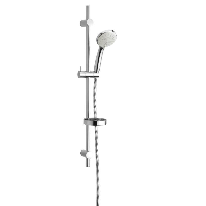 dusjgarnityr med fleksibelt veggfeste, maks avstand 740mm. Tre innstillinger på stråle. Sparedyse i hånddusj som enkelt kan fjernes.