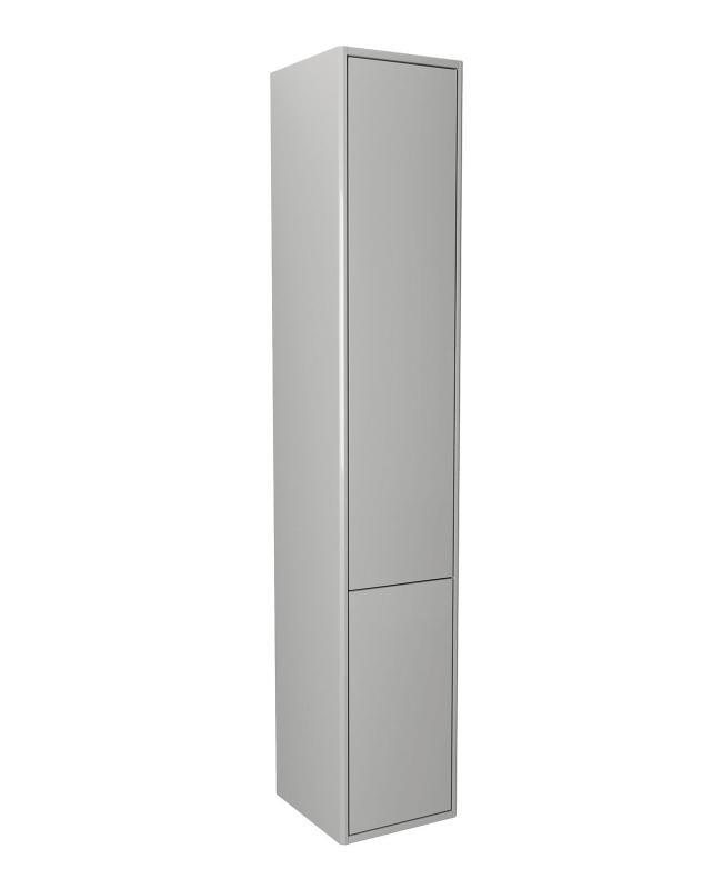 Gustavsberg Graphic høyskap med varm grå, glatt front, 32 cm dypt. Med smart oppbevaring i den øverste døren. Kan settes sammen til moduler med Graphic veggskap og høyskap. Festesystem som er enkelt å montere og justere på veggen.