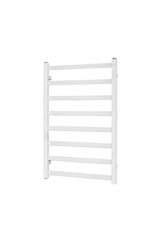 Håndkletørker med firkantet rør i hvit matt lakkert stål. Håndkletørkeren kan tilkobles både eksisterende vannbårent system eller med el.- patro