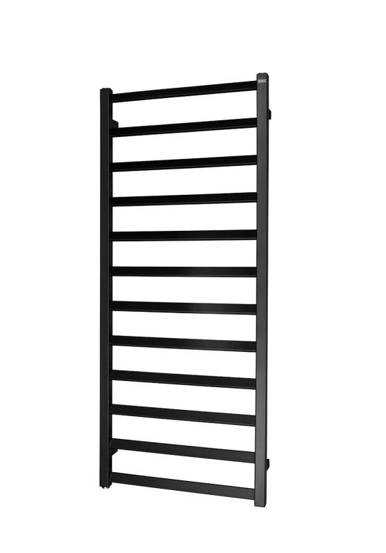 Håndkletørker med firkantet rør i sort matt lakkert stål. Håndkletørkeren kan tilkobles både eksisterende vannbårent system eller med el.- patro