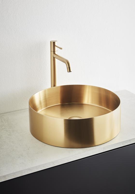 Tynn frittstående servant av rustfritt stål med børstet finish. Velg mellom fargene messing og svart krom. Overflaten beholder sin vakre farge over tid. Uten overløp, bunnventil inkludert. Kombineres med høyt blandebatteri som monteres på benkeplaten. Kompletter med Smart vannlås 1265605 eller PUM vannlås 1265600.