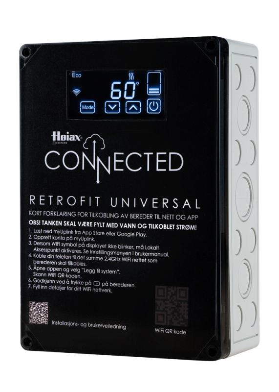 Du kan få full CONNECTED-funksjonalitet på din gamle skumisolerte Høiax varmtvannsbereder ved å oppgradere med en RetroFit-løsning. Universal varianten benyttes til å oppgradere eksisterende Høiax-beredere som har et utvendig justerbart temperaturratt, slik at de får Høiax CONNECTED-funksjonalitet. Høiax CONNECTED Universal kan benyttes på beredere som har ett-trinns element eller tre-trinns element.