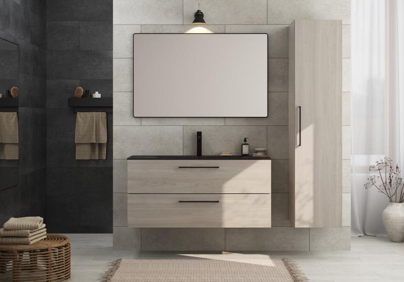 INGRID 120 cm Lys Eik med VALE glasservant. ØYRI speil utan lys med sort ramme, høgskap 40 cm med hyller og grep i svart eik/ svart.